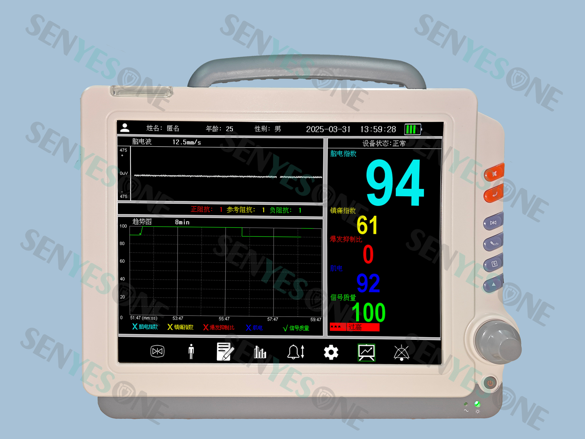 近年醫(yī)欣科技來(lái)在麻醉深度監(jiān)測(cè)方面,取得了重大研發(fā)成果,新監(jiān)測(cè)技術(shù)包含了麻醉深度指數(shù)、鎮(zhèn)痛指數(shù)、面部肌電指數(shù)和爆發(fā)抑制比。尤其是鎮(zhèn)痛指數(shù)的出現(xiàn),填補(bǔ)了麻醉深度監(jiān)測(cè)缺少鎮(zhèn)痛監(jiān)測(cè)的空白,與麻醉深度聯(lián)合使用不僅可以杜絕術(shù)中知曉和避免麻醉過(guò)深,還可以根據(jù)不同患者的基礎(chǔ)意識(shí)值實(shí)現(xiàn)差異化精確麻醉,解決了諸多臨床麻醉問(wèn)題,真正實(shí)現(xiàn)了鎮(zhèn)靜、鎮(zhèn)痛同步監(jiān)測(cè),得到眾多麻醉專(zhuān)家學(xué)者的認(rèn)可!