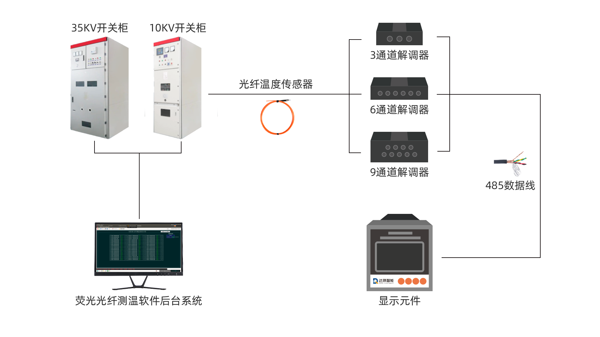 對(duì)高壓開關(guān)柜的斷路器靜觸頭、母排、電纜接頭等長(zhǎng)期處于高電壓、大電流的工作狀態(tài)的熱點(diǎn),采用熒光光纖溫度傳感技術(shù),熒光光纖溫度傳感器探頭可直接緊貼觸點(diǎn)或接點(diǎn)表面進(jìn)行有效、準(zhǔn)確的溫度監(jiān)測(cè),且不會(huì)改變柜體原有的電氣絕緣性能。實(shí)現(xiàn)在本地和遠(yuǎn)程實(shí)時(shí)監(jiān)測(cè)開關(guān)柜內(nèi)各熱點(diǎn)溫度變化情況,及時(shí)發(fā)出報(bào)警信息,確保高壓開關(guān)柜的安全運(yùn)行。