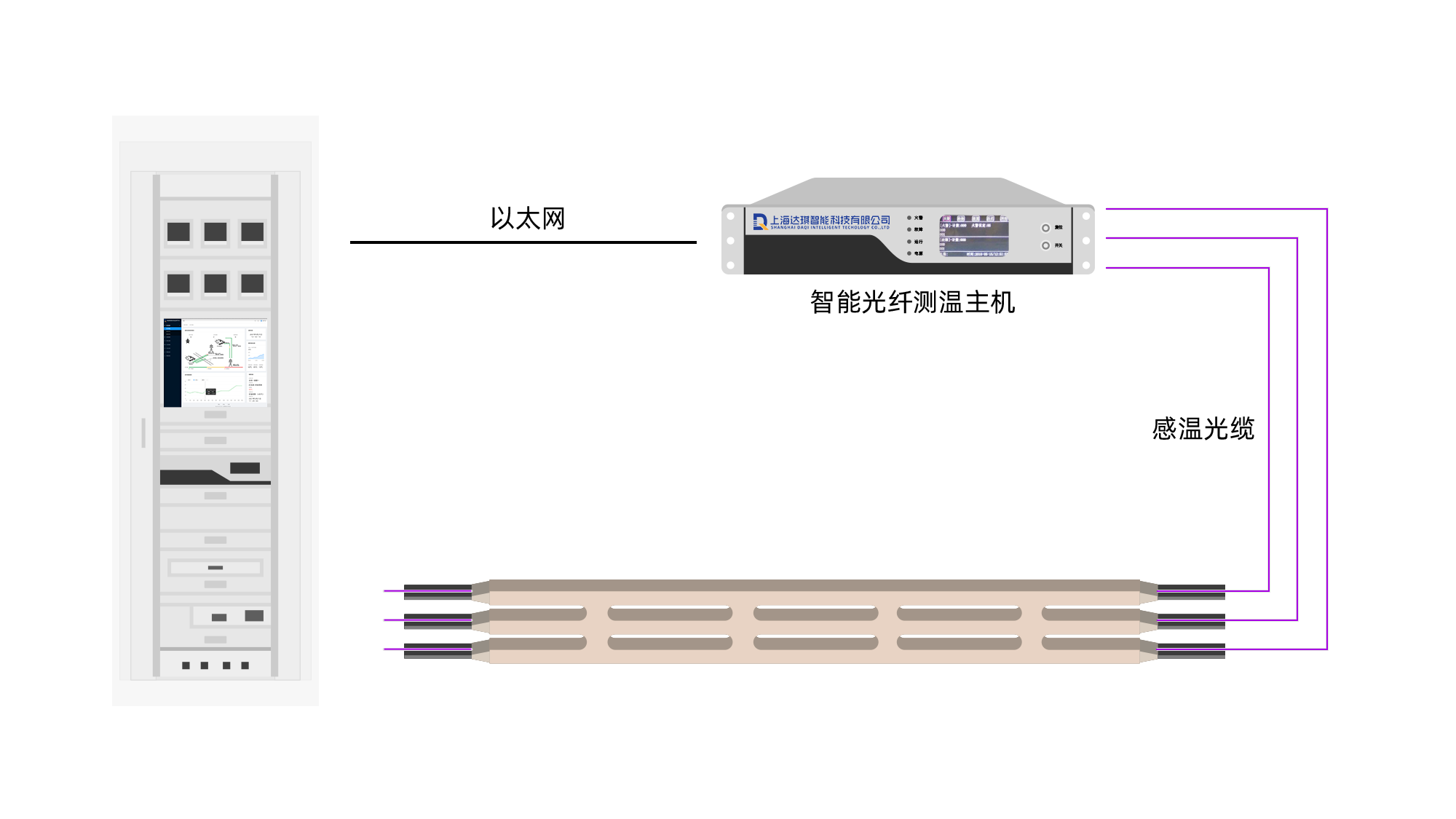 利用智能光纖測(cè)溫技術(shù),將感溫光纖穿入澆注型母線內(nèi)的光纖引導(dǎo)管中,其中引導(dǎo)管預(yù)先埋設(shè)在母線中并與母線一起澆筑成型。引導(dǎo)管緊貼母線電纜的部位,確保感溫光纖對(duì)母線的運(yùn)行溫度進(jìn)行真實(shí)可靠的實(shí)時(shí)在線監(jiān)測(cè),隨時(shí)跟蹤母線溫度變化的過程并對(duì)發(fā)熱點(diǎn)進(jìn)行準(zhǔn)確定位和異常報(bào)警,維護(hù)母線運(yùn)行安全。