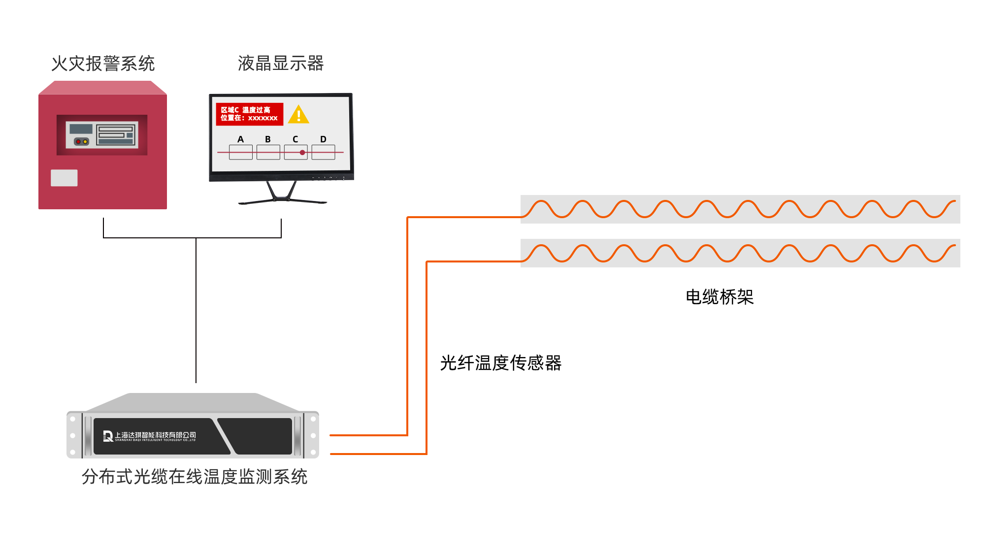 利用智能光纖測溫技術(shù),通過敷設(shè)在電纜橋架上的感溫光纖來實時感應(yīng)電纜的溫度,由智能光纖測溫主機(jī)實時監(jiān)測電纜橋架溫度變化。出現(xiàn)火災(zāi)隱患時,測溫主機(jī)立即發(fā)出報警信號并迅速定位,并聯(lián)動火災(zāi)報警設(shè)備,消除險情。