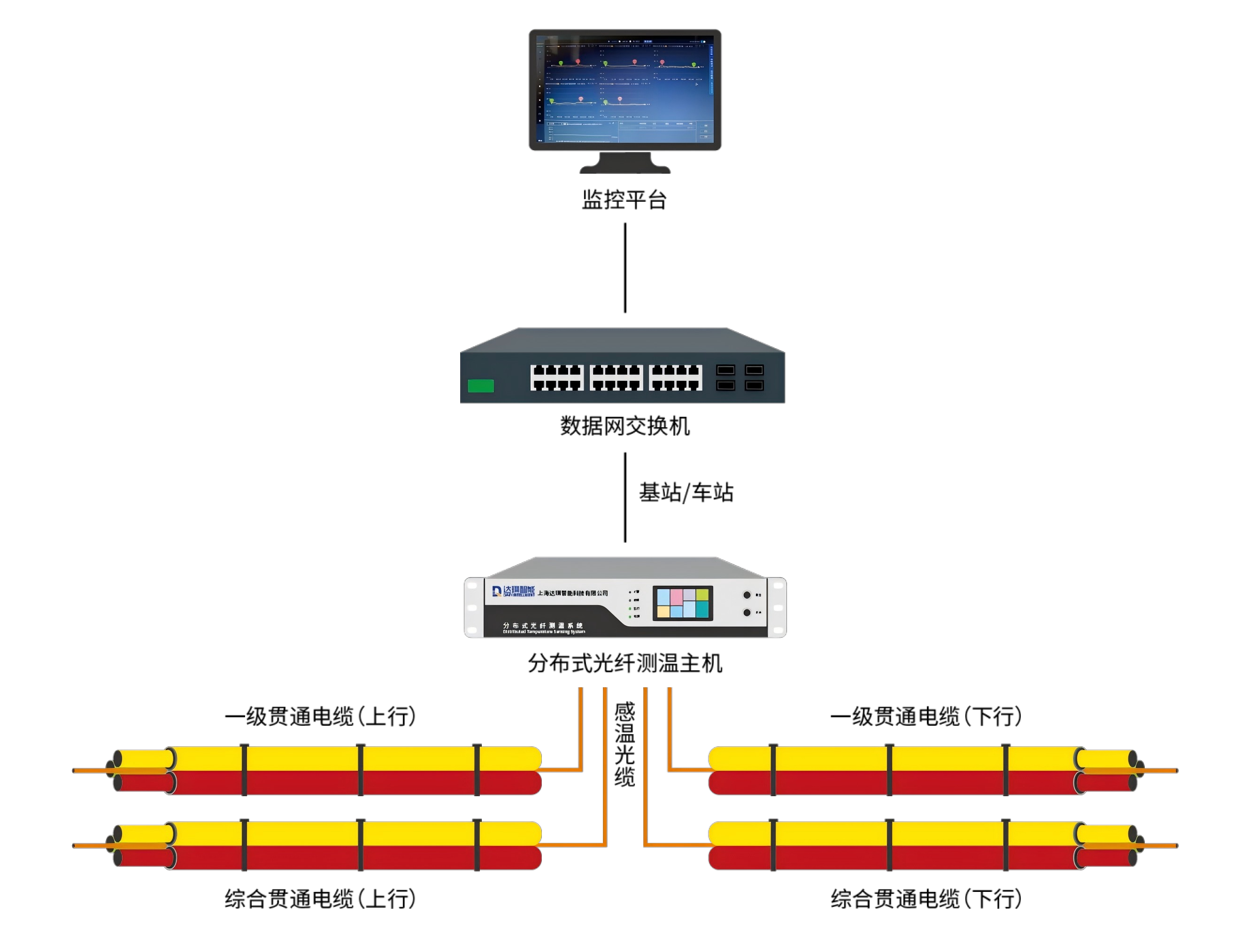 在貫通電纜通往配電所布置光纖在三相電纜品字形中間,通過(guò)在線監(jiān)測(cè)貫通線全線電纜溫度數(shù)據(jù)、異常點(diǎn),電纜接頭的局放信號(hào)的幅值、相位等數(shù)據(jù),以及分析短路或接地瞬間的波形數(shù)據(jù),對(duì)電纜故障進(jìn)行預(yù)警或故障定位,從而實(shí)現(xiàn)對(duì)整個(gè)電纜故障的實(shí)時(shí)在線監(jiān)測(cè)和故障定位。
